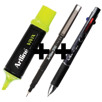 ARTLINE 200 FINELINER BLACK + 4-COLOUR PEN + VIVIX HIGHLIGHTER YELLOW WRITING BUNDLE