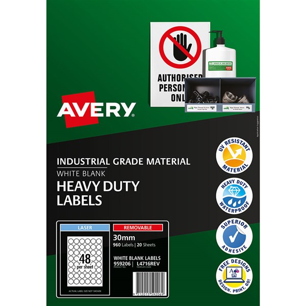 AVERY 959206 REMOVABLE HEAVY-DUTY LABELS 30MM WHITE PACK 20