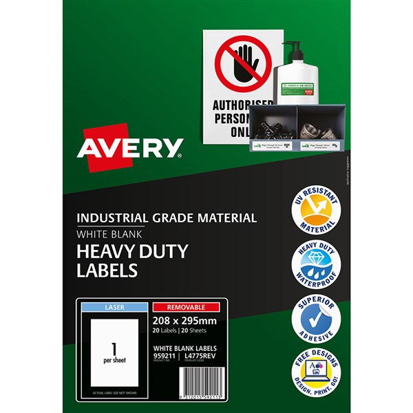 AVERY 959211 REMOVABLE HEAVY-DUTY LABELS 210 X 297MM WHITE PACK 20
