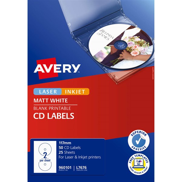 AVERY 960101 L7676 LASER LABELS MEDIA FULL FACE CD/DVD 2UP PACK 25