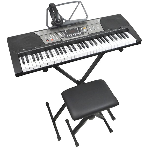- The pack includes headphones, a stand, a bench, a music rest, and a power adapter, allowing you to play anytime without disturbing others