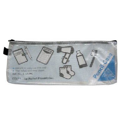 - High quality zippered pouch, made from water-resistant mesh reinforced PVC, with fabric finger loop and fabric-backed metal zip