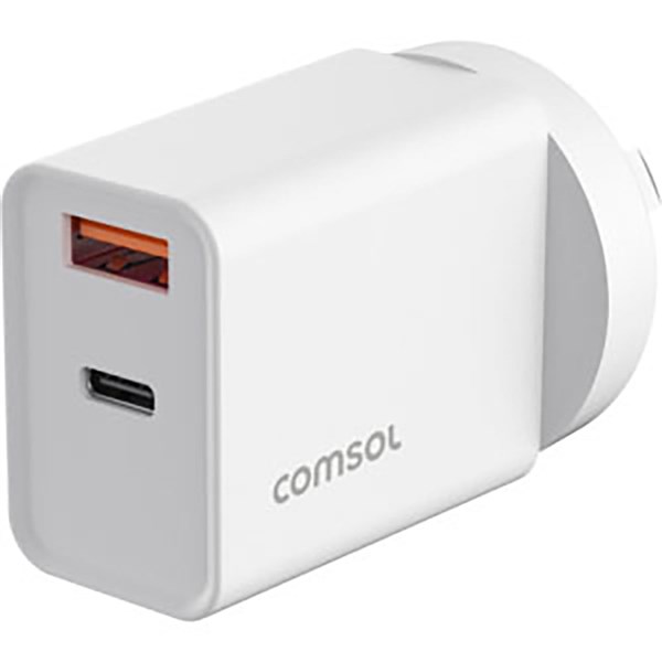 This is a Comsol 20W dual port USB wall charger designed for convenient everyday charging