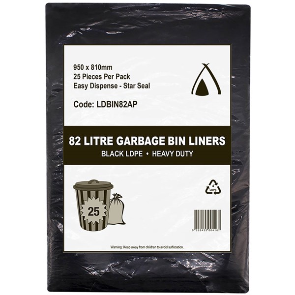 HUHTAMAKI HEAVY DUTY LDPE BIN LINER STAR SEAL 82 LITRE 950 X 810MM BLACK PACK 25