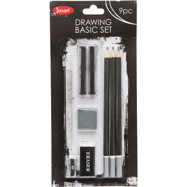 - Basic Drawing Set of 9 includes- 3 Sketching Pencils (2B, 4B and 6B), 2 Charcoal Sticks, 1 Sharpener, 1 Kneadable Eraser, 1 White Eraser, 1 Paper Stump