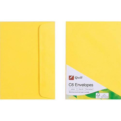 QUILL C6 COLOURED ENVELOPES PLAINFACE STRIP SEAL 80GSM 114 X 162MM LEMON PACK 25