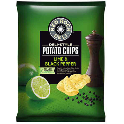 Red Rock Deli Potato Chips Lime and Black Pepper flavoured potato chips are seasoned with freshly ground peppercorns and the tangy zing of fresh limes with