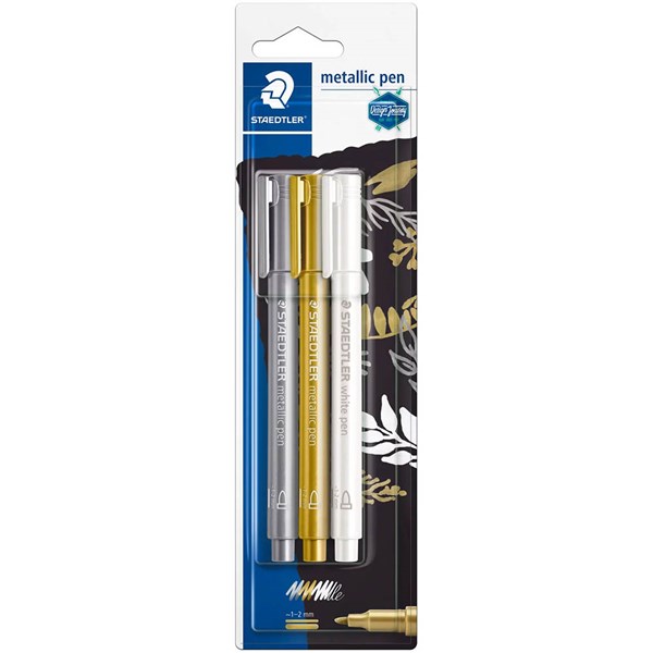 - Blistercard containing 3 metallic pen in assorted colours (gold, silver, white)