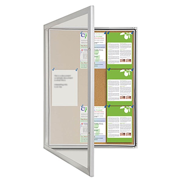 - This 1350 x 980mm cork pinboard includes dual lockable clear polycarbonate doors, a water-resistant seal, and a strong satin silver aluminium frame – ideal for schools, councils, and site entry points requiring reliable outdoor communication