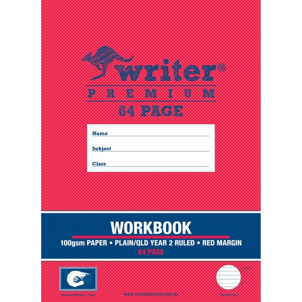 WRITER PREMIUM WORKBOOK PLAIN/QLD RULED YEAR 2 64 PAGE 100GSM 330 X 240MM PRAWN