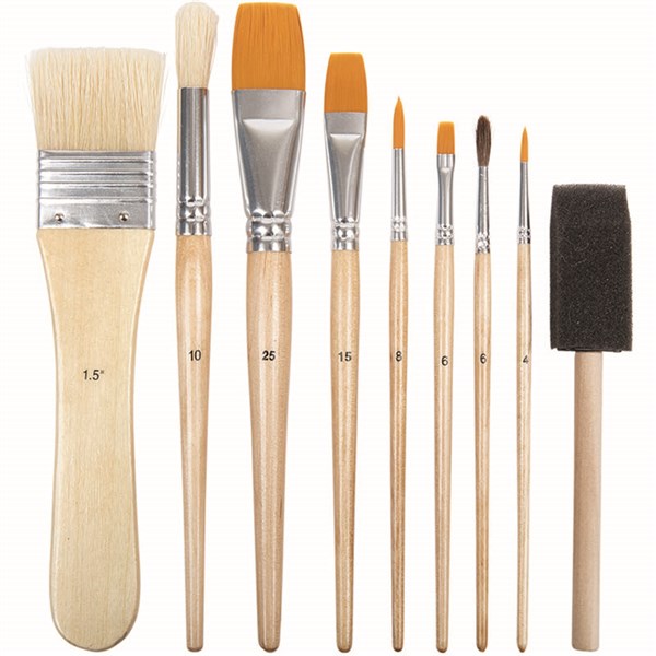 This set includes a Foam Brush 25mm, Wide Bristle Brush (32.5mm), Round Synthetic Taklon Brushes (#4 and #10), Flat Synthetic Taklon Brushes (6mm, 15mm and 25mm), Fine Hair Watercolour Brush Round (#6), and Hog Hair Bristle Brush Round (#10)