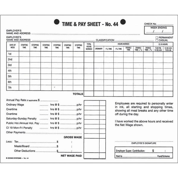 ZIONS 44 TIME AND PAY SHEETS 175 X 215MM PACK 100