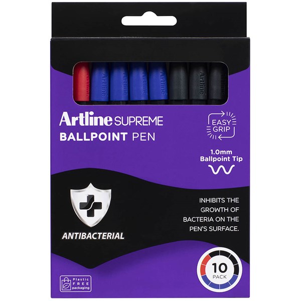 ARTLINE SUPREME ANTIMICROBIAL BALLPOINT PEN 1.0MM ASSORTED PACK 10