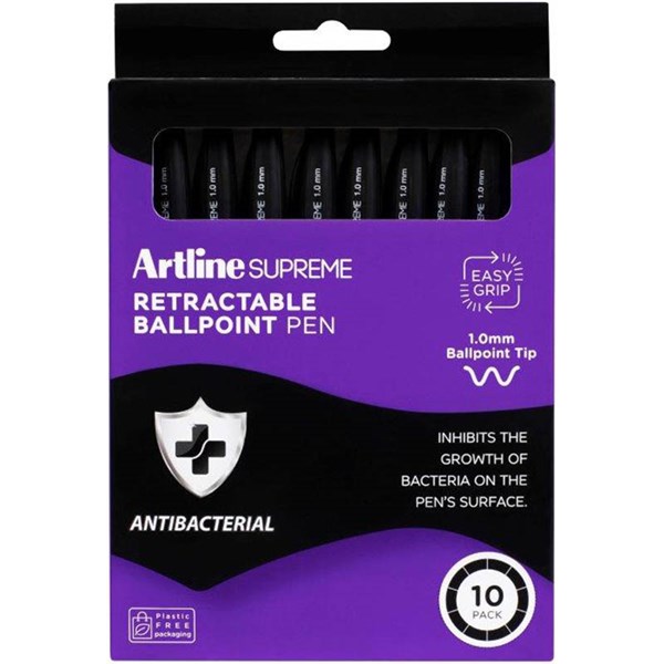 ARTLINE SUPREME ANTIMICROBIAL RETRACTABLE BALLPOINT PEN 1.0MM BLACK PACK 10