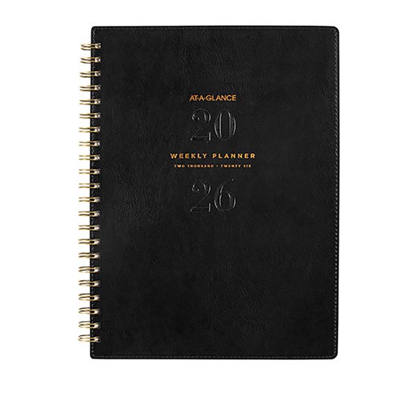 The At-A-Glance signature planner range offers unique gender-neutral cover materials paired with antique bronze twin wire binding to give a sophisticated look