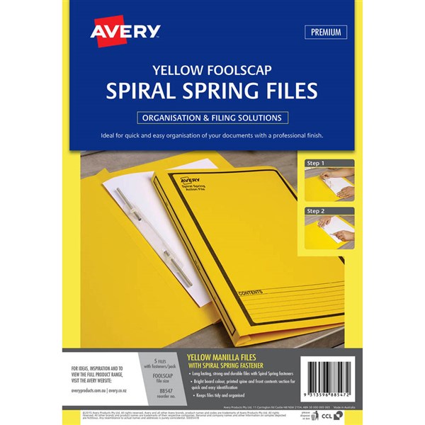 AVERY 88547 SPIRAL SPRING ACTION FILE FOOLSCAP YELLOW PACK 5