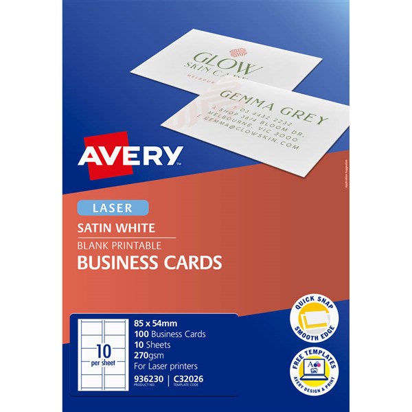 AVERY 936230 C32026 QUICK CLEAN BUSINESS CARD DOUBLE SIDED 270GSM 85 X 54MM SATIN WHITE PACK 100