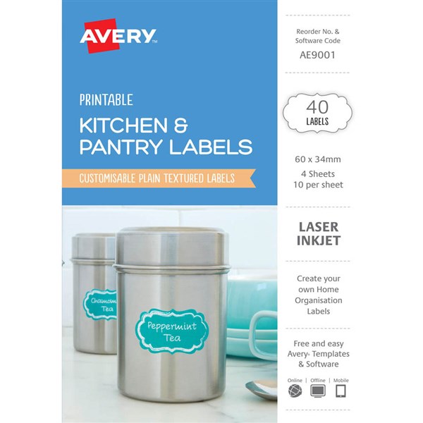 Create your own stylish and personalised organisation solutions with Avery textured white printable Kitchen and Pantry Labels