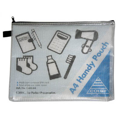 - High quality zippered pouch, made from water-resistant mesh reinforced PVC, with fabric finger loop and fabric-backed metal zip