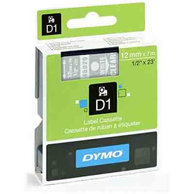 DYMO 45020 D1 LABELLING TAPE 12MM X 7M WHITE ON CLEAR