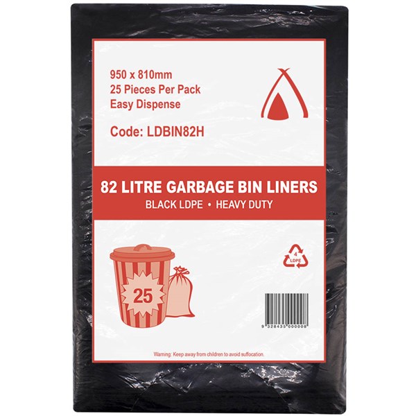 HUHTAMAKI HEAVY DUTY LDPE BIN LINER 82 LITRE 950 X 810MM BLACK PACK 25