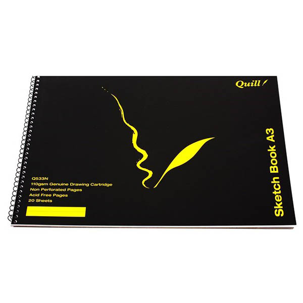 Quill Sketch Books feature premium quality 110gsm cartridge paper, black water-resistant and durable polypropylene front cover and heavy cardboard back cover