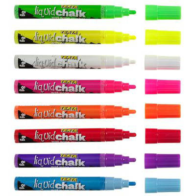 Texta wet wipe liquid chalk markers are water soluble so they simply wipe clean of any non-porous surface using a damp cloth