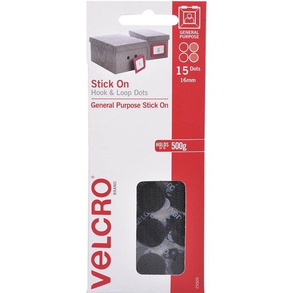 VELCRO BRAND STICK-ON HOOK AND LOOP DOTS 16MM BLACK PACK 15