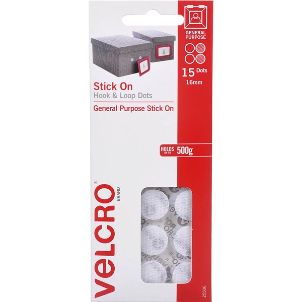 VELCRO BRAND STICK-ON HOOK AND LOOP DOTS 16MM WHITE PACK 15