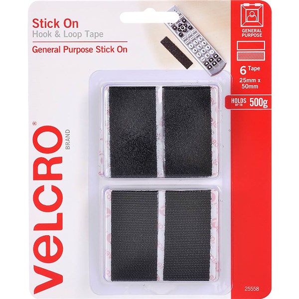 VELCRO BRAND STICK-ON HOOK AND LOOP RECTANGLES 25 X 50MM BLACK PACK 6