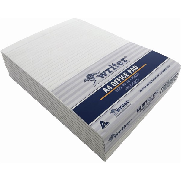 WRITER OFFICE PAD 8MM RULED 50GSM 100 SHEET A4 WHITE PACK 10